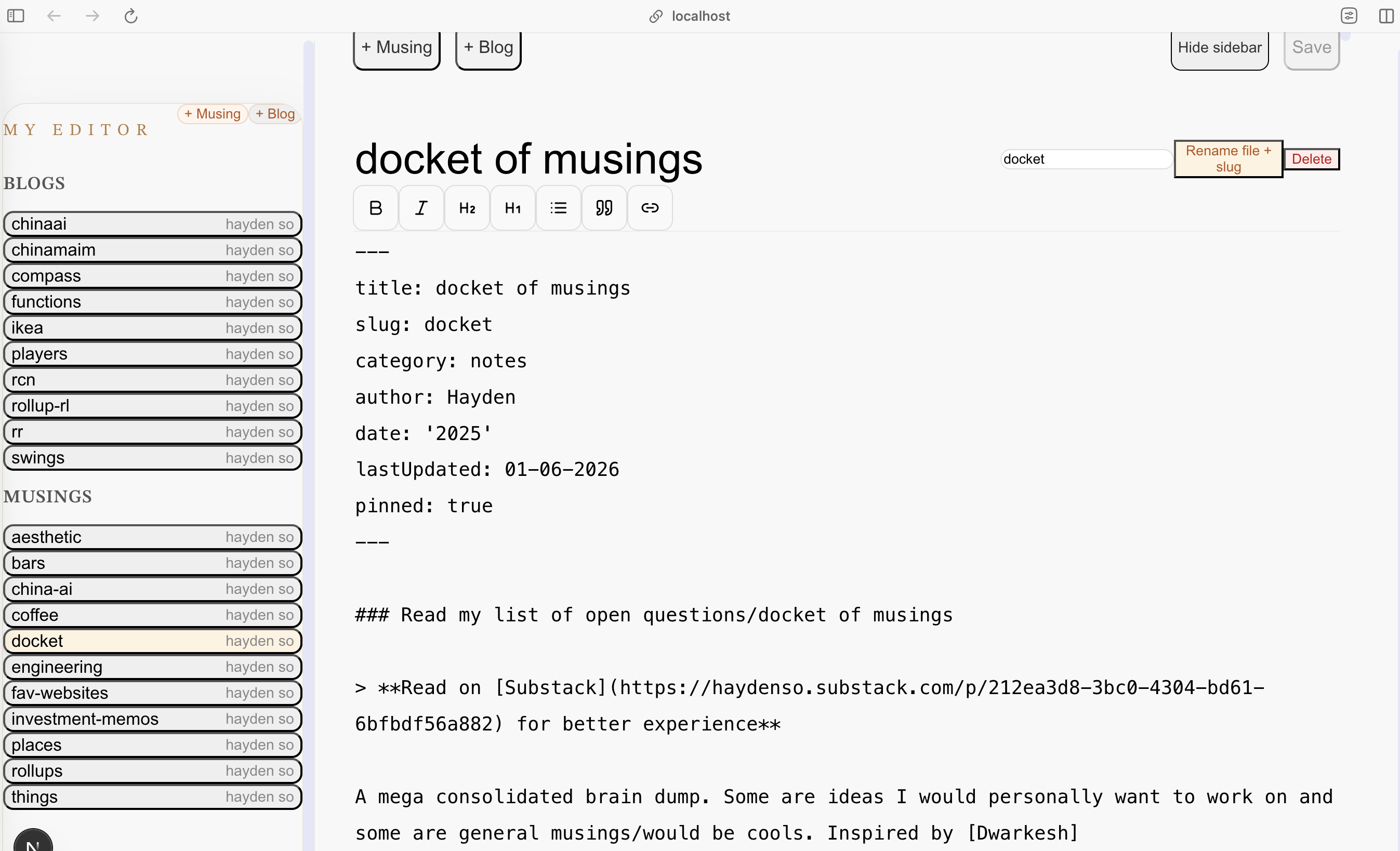 Initially I probably used three to four premium requests to build my own custom text or blog management system (CMS) via some custom UI in Next.js powered by some Python text editor module. The issue of that was a lot of good features of text editors were pretty hard (or time consuming to test + implement in a satisfactory way), such as having automatic bolding and italics and color and all sorts of features; it made it quite difficult to make my writing experience that good. And I want it to be fun to write.