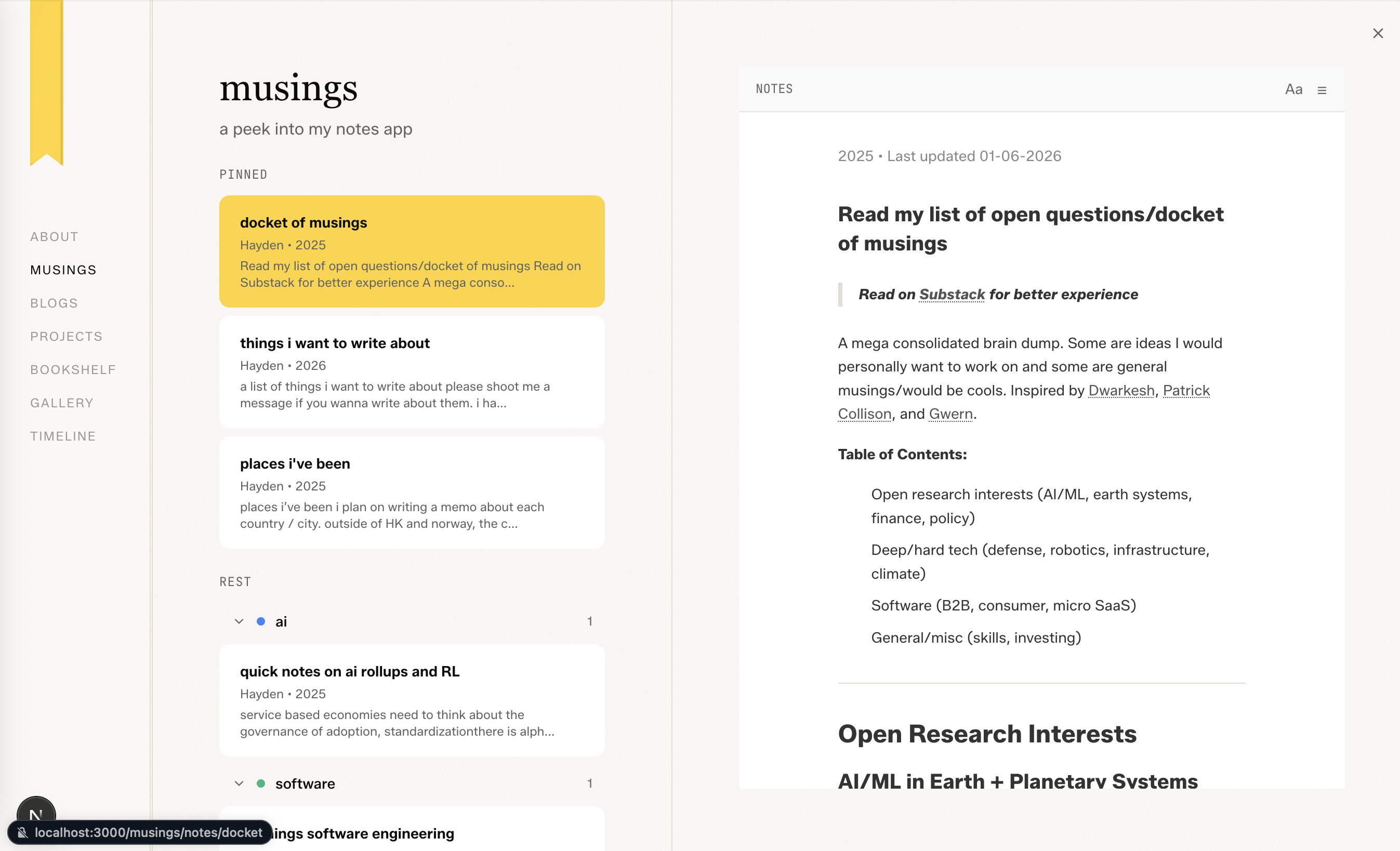 tl;dr my musings (short notes) are automatically connected to a specific folder in my apple notes app where everytime I make edits or new notes it reflects (no Apple API used, done via AppleScript and custom bash/python files)